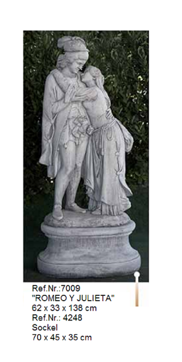 „ ROMEO Y JULIETA „ ist das wohl bekannteste Liebespaar der Welt. Wir haben dieses Liebespaar als Statue in einen antiken Guss aus Witterung - und frostbeständigem Weißstein in den Farben Grau, Braun oder Ocker anzubieten, der in aufwendiger Handarbeit in Andalusien hergestellt wird. Diese antike Figur verleiht jedes Anwesen oder Terrasse einen mediterranen Touch. Der Sockel mit der Ref. Nr. 4248 ist nicht im Preis enthalten und kann auf Wunsch extra Bestellt werden.