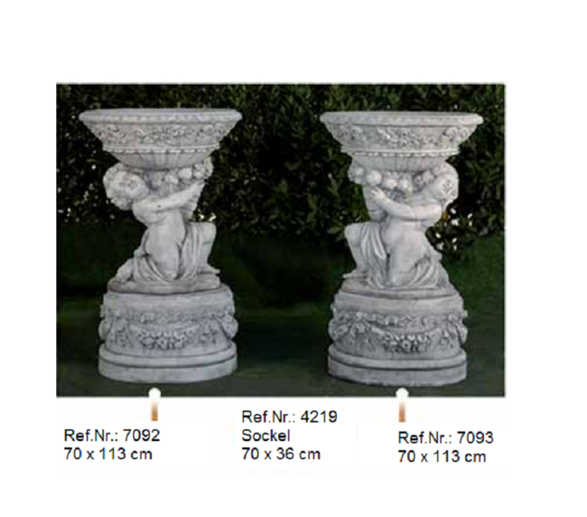 Die beiden Kinderskulpturen mit einer Schale auf der linken und der rechten Schulter. Die Schalen kann man für Wasserspiele oder als Pflanzkübel nutzen. Die Skulpturen stehen auf einen Sockel, der im Preis der jeweiligen Skulptur enthalten ist, aber auf Wunsch aber alleine gekauft werden kann.Der Sockel hat die Ref.Nr. 4219